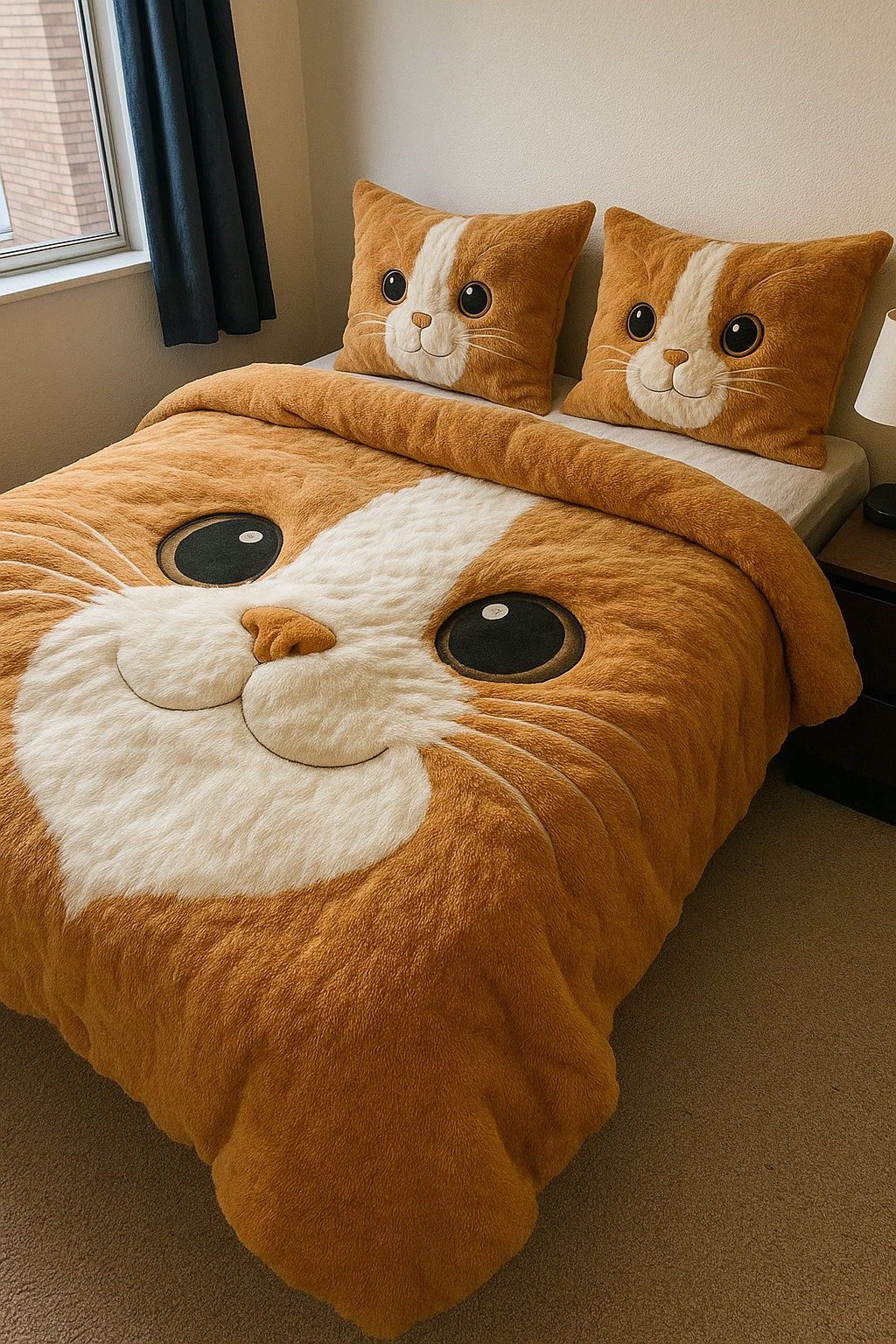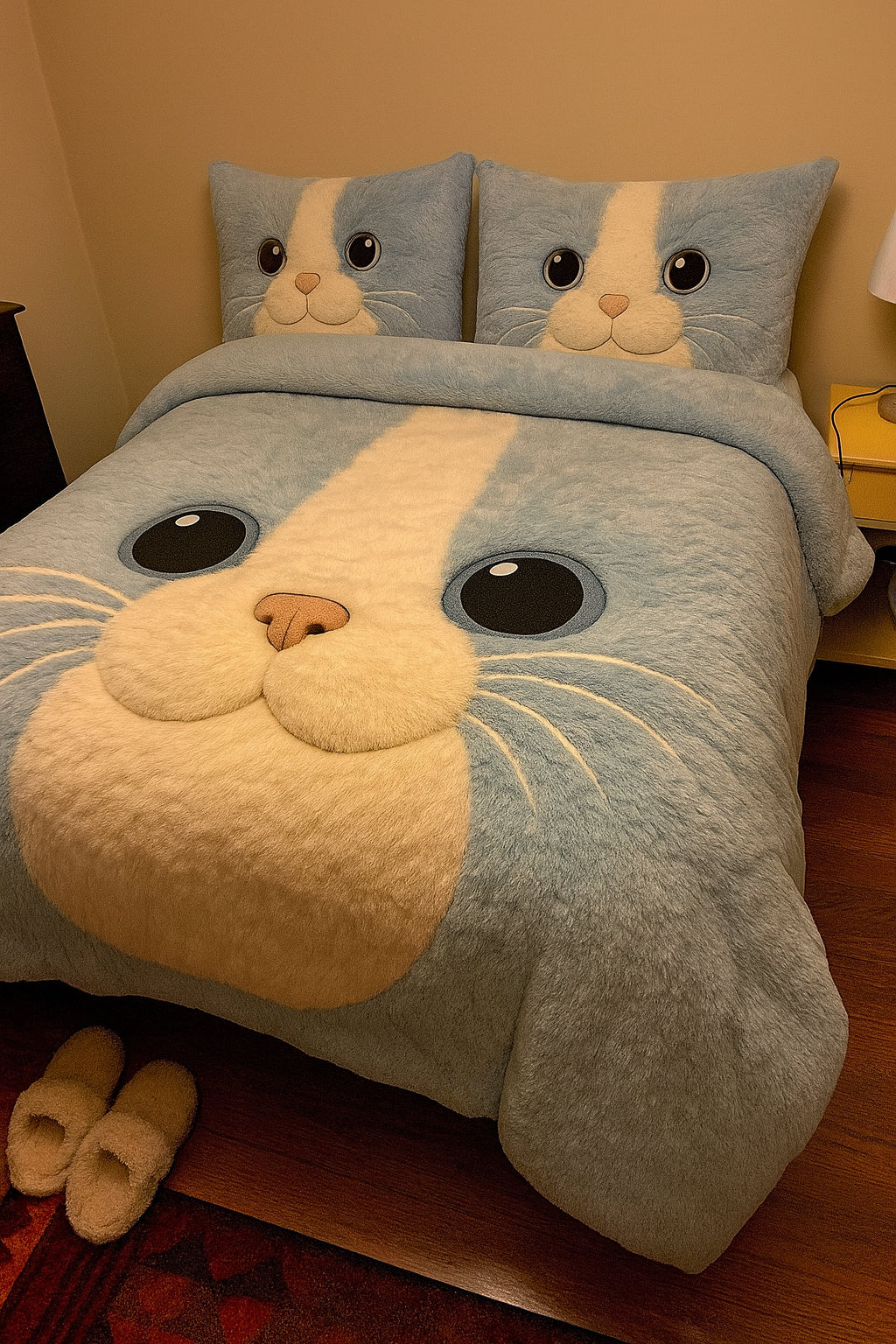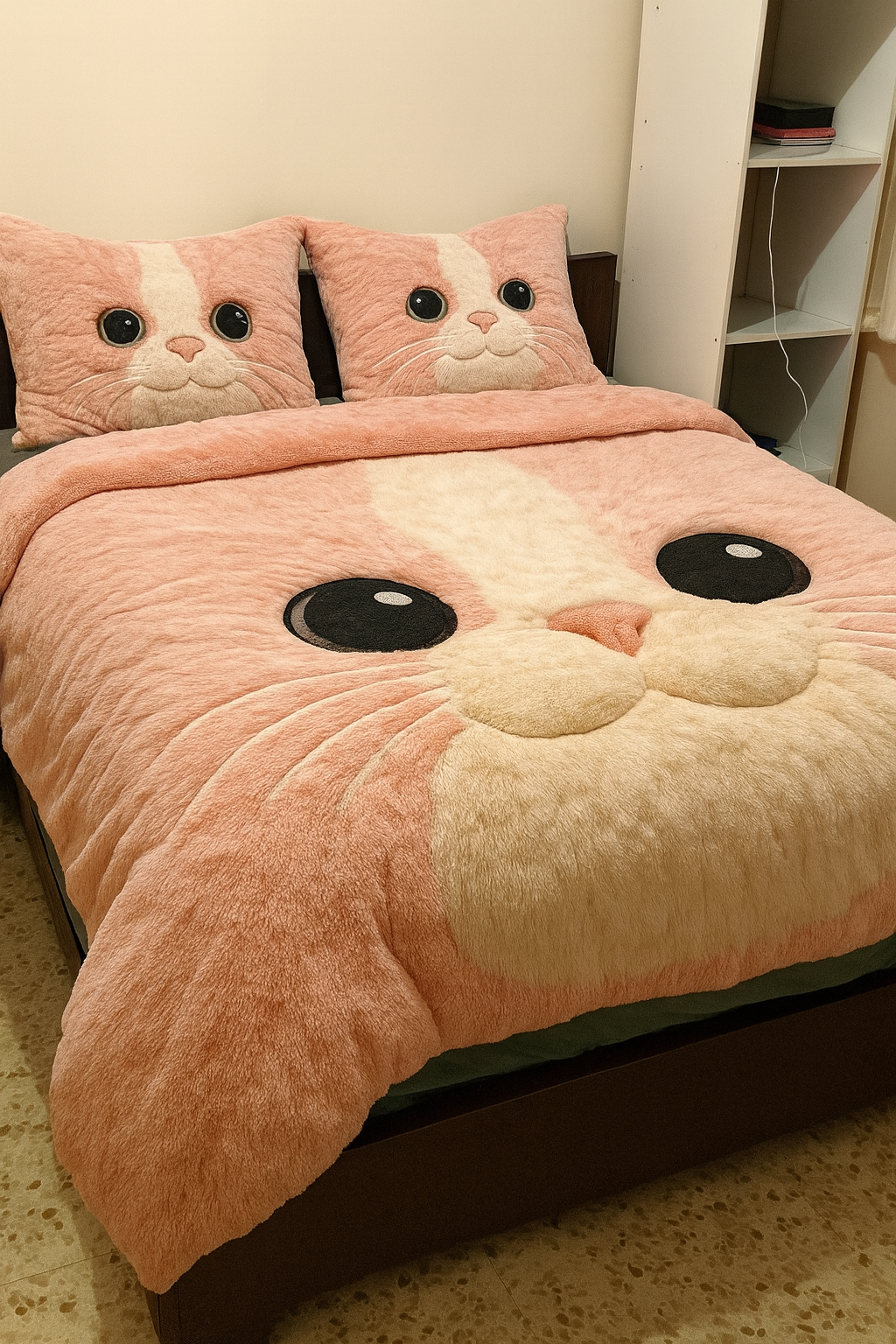Bu nevresim takımı, dev ve süper sevimli kedi yüzü baskısı sayesinde yatak odanıza neşe ve pozitif enerji getirir.
